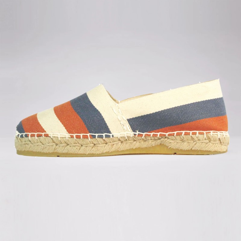 Les fameuses rayures basques ! Toujours le dessus en coton, la couture entièrement faite de la main de nos couturières, le "bout musette" qui apporte du chaussant en bout de pied et enfin la semelle épaisse, 30 fils, droite, terminée par une couche de caoutchouc naturel parfumé à la citronnelle... pour faire fuir les moustiques!