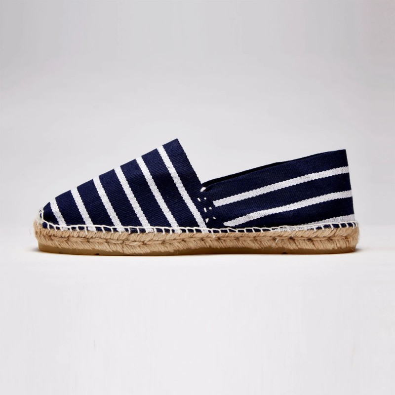 Les fameuses rayures basques ! Toujours le dessus en coton, la couture entièrement faite de la main de nos couturières, le "bout musette" qui apporte du chaussant en bout de pied et enfin la semelle épaisse, 30 fils, droite, terminée par une couche de caoutchouc naturel parfumé à la citronnelle... pour faire fuir les moustiques!