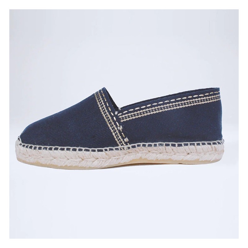 Les fameuses rayures basques ! Toujours le dessus en coton, la couture entièrement faite de la main de nos couturières, le "bout musette" qui apporte du chaussant en bout de pied et enfin la semelle épaisse, 30 fils, droite, terminée par une couche de caoutchouc naturel parfumé à la citronnelle... pour faire fuir les moustiques!